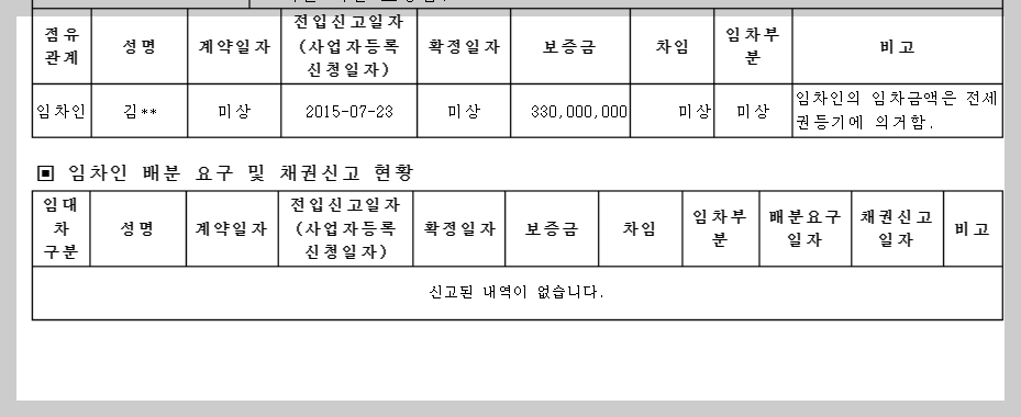 점유관계도 볼 수 있는데 보증금도 있네요. 전세권이 등기되어 있습니다. 하단에 배분 요구 및 채권신고 현황이 있습니다. 권리 분석 잘 하셔서 내가 인수해야 하는 금액일지 꼭 확인하시고 입찰하셔야 합니다.