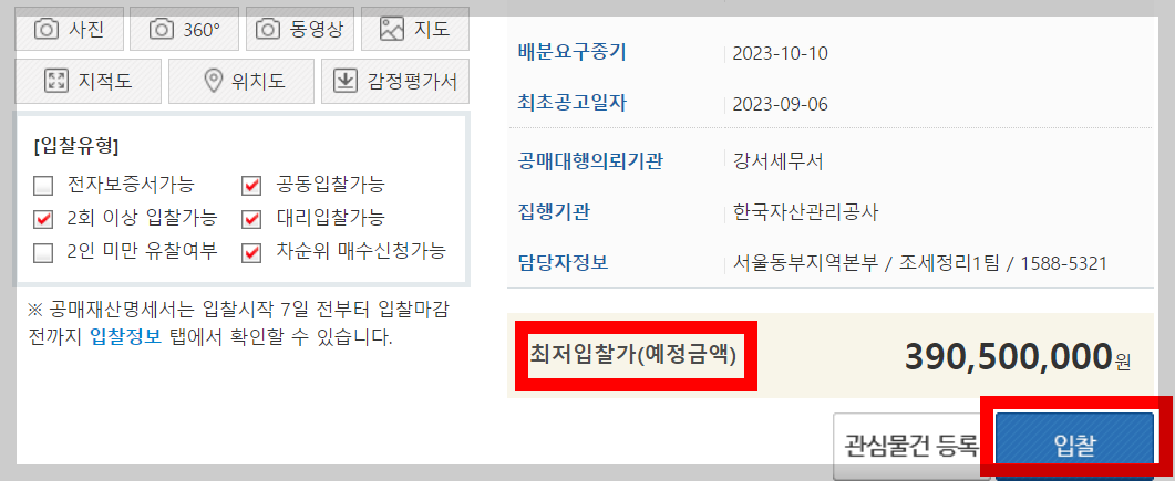 입찰정보 : 시간별로 볼 수 있습니다. 2023.10.23 부터 유찰이 계속 되어서 현재 최저입찰가가 많이 떨어졌네요.
