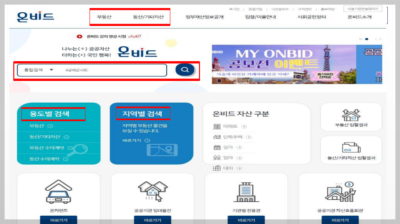 온비드 사이트 메인화면  : 물건 보는 법