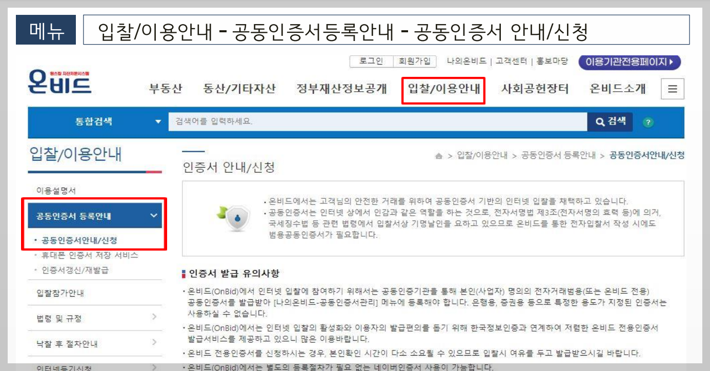 입찰/이용안내 - 공동인증서등록안내 - 공동인증서 안내/ 신청