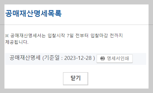공매재산명세는 로그인을 해야 볼 수 있습니다. 입찰시작 7일 전부터 입찰마감 전까지 제공됩니다. 재산명세서 기준일도 나옵니다. 저도 클릭해보았습니다.