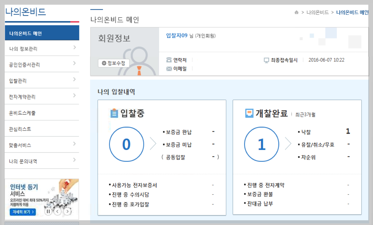 입찰 결과는 나의온비드 - 입찰관리 - 입찰결과내역에서 확인할 수 있습니다.