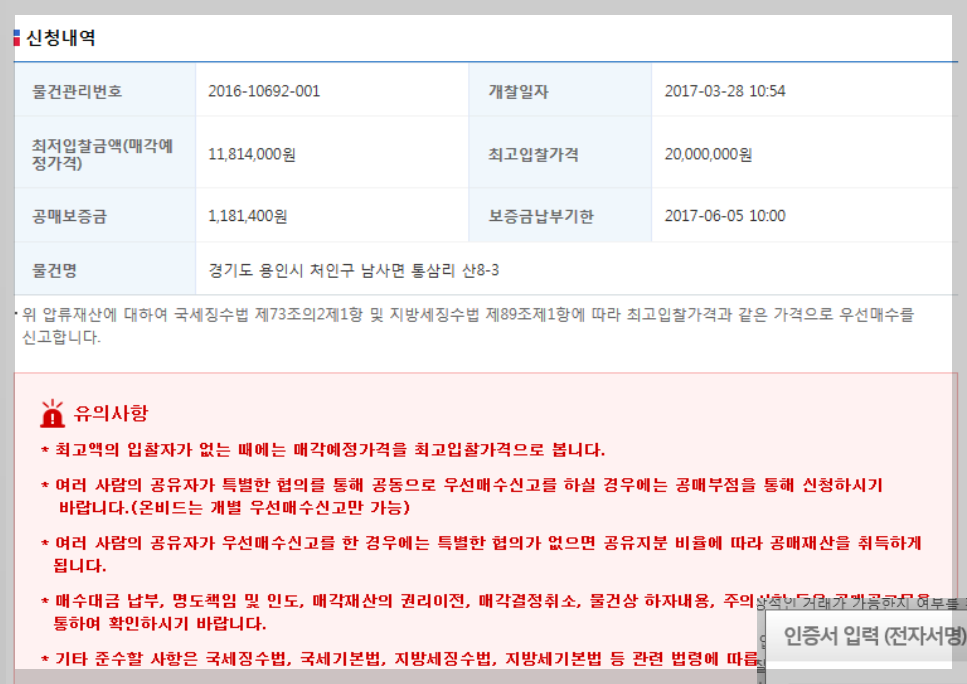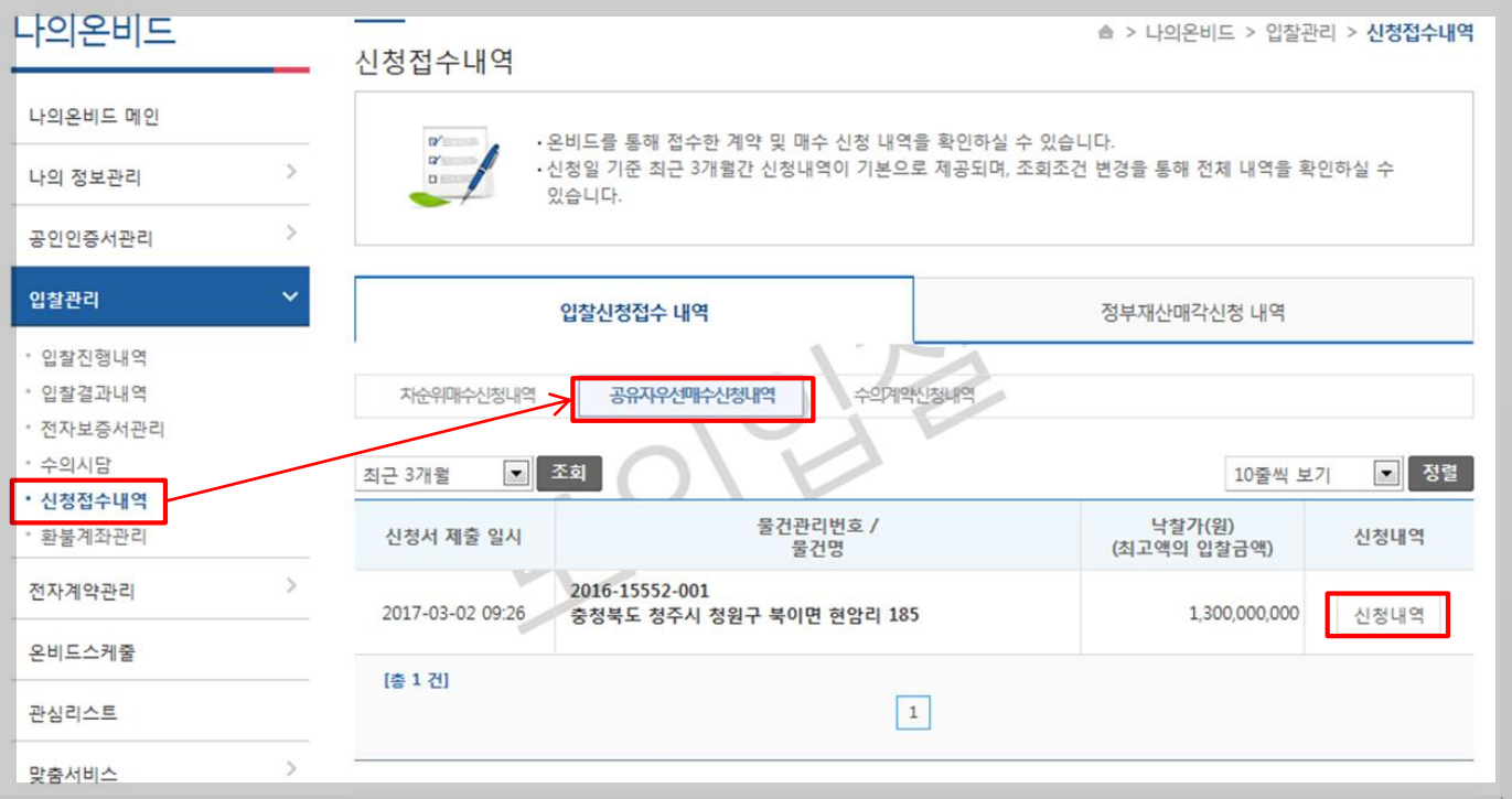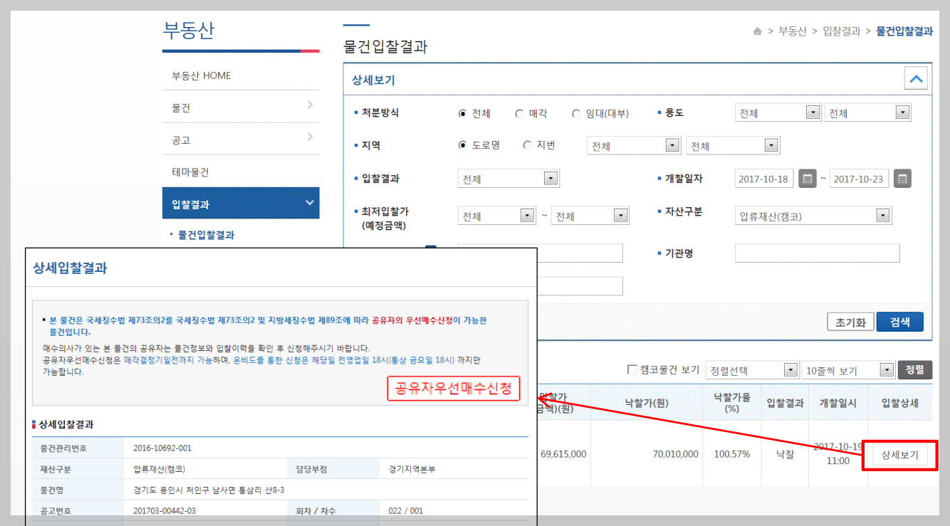 부동산 - 입찰결과 - 물건입찰결과 - 상세보기 - 공유자우선매수신청 클릭