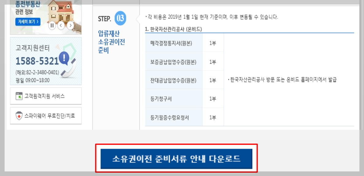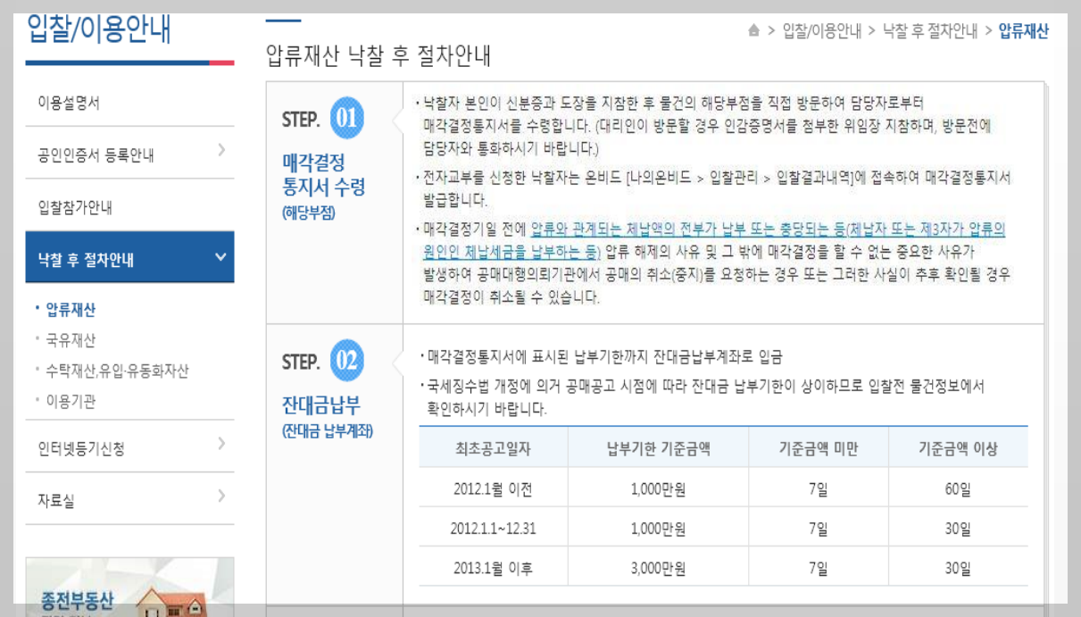 입찰/이용안내 - 낙찰 후 절차안내 - 압류재산 탭으로 들어가보면 메뉴얼이 자세하게 나옵니다. 세 가지 절차에요. 매각결정통지서 수령 -> 잔대금(잔금) 납부 -> 압류재산 소유권 이전 준비