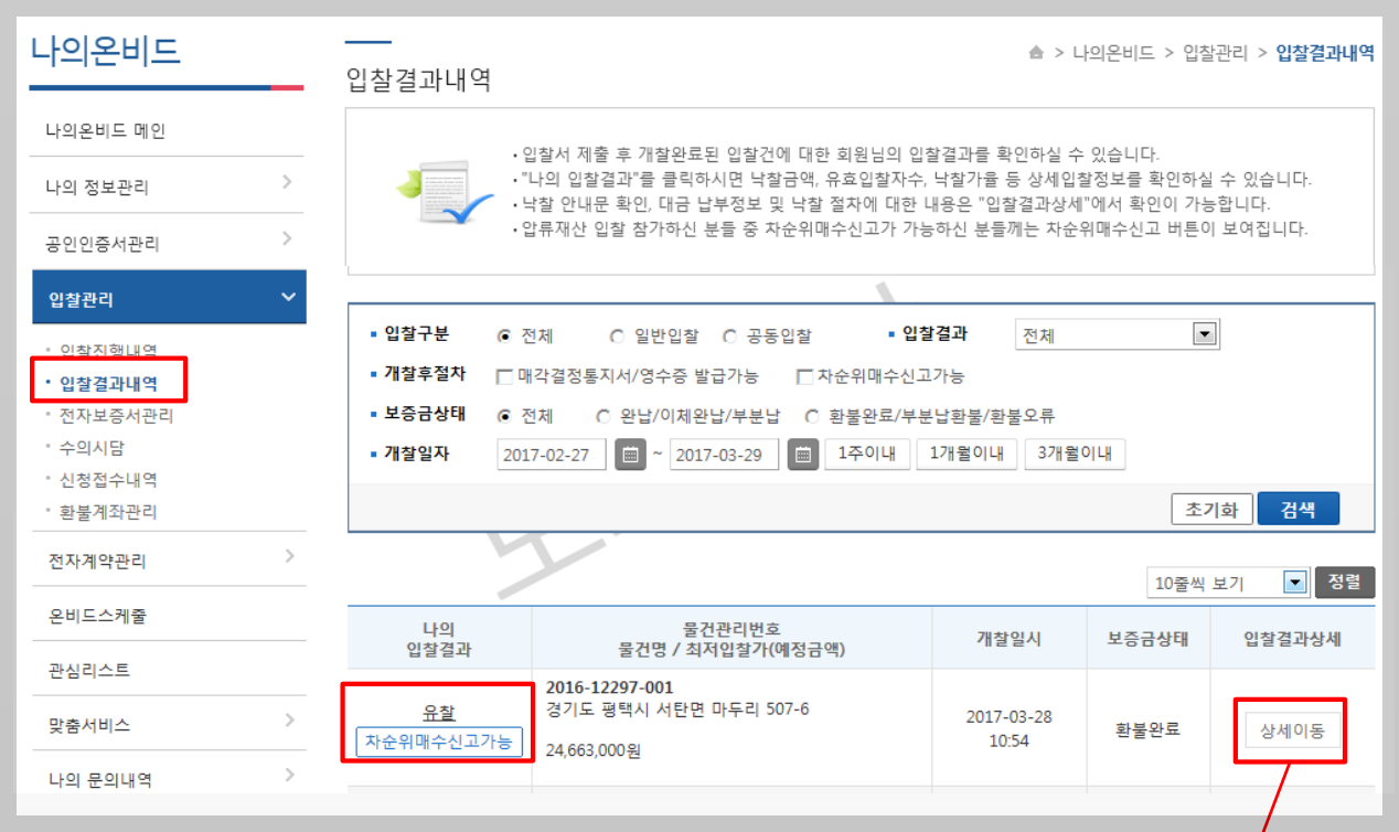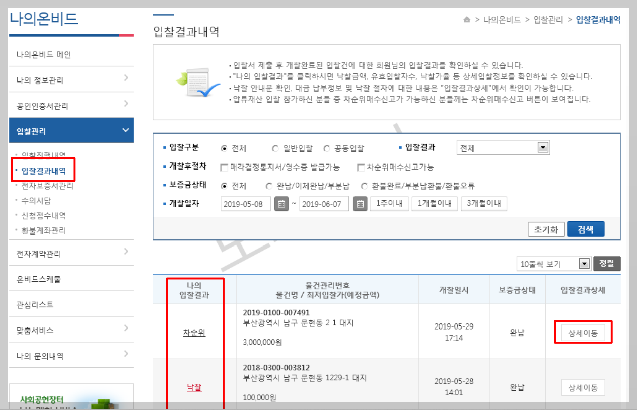 나의 온비드 - 입찰관리 - 입찰결과내역