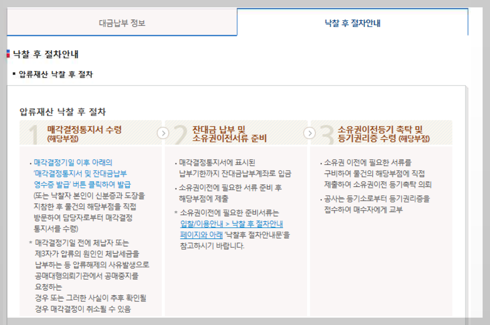 입찰/이용안내 - 낙찰 후 절차안내 - 압류재산 탭으로 들어가보면 메뉴얼이 자세하게 나옵니다. 세 가지 절차에요. 매각결정통지서 수령 -> 잔대금(잔금) 납부 -> 압류재산 소유권 이전 준비