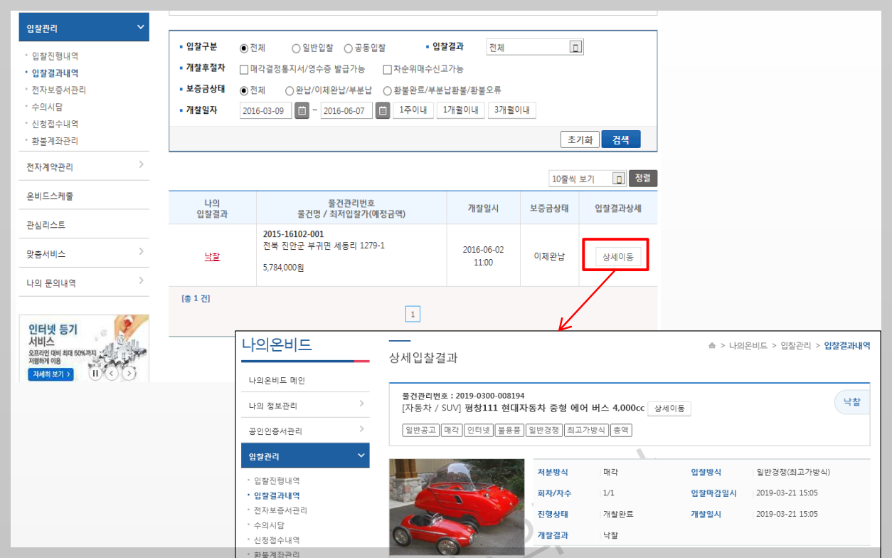 나의 온비드 - 입찰관리 - 입찰결과내역