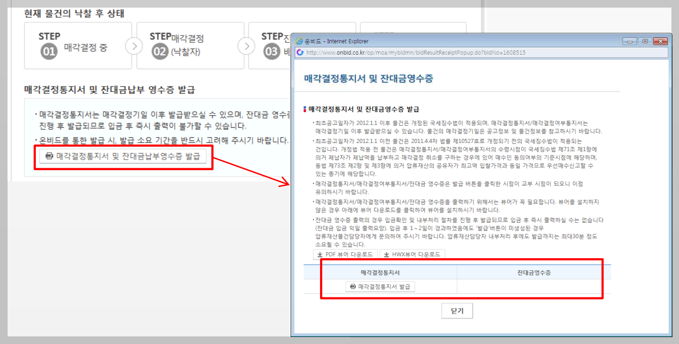 입찰 시 매각결정통지서/잔대금영수증 수령을 '전자송달'로 신청했을 때는 온비드에서 신청 가능합니다. 미 신청했을 때는 공고부점에 직접 가서 수령해야 합니다.