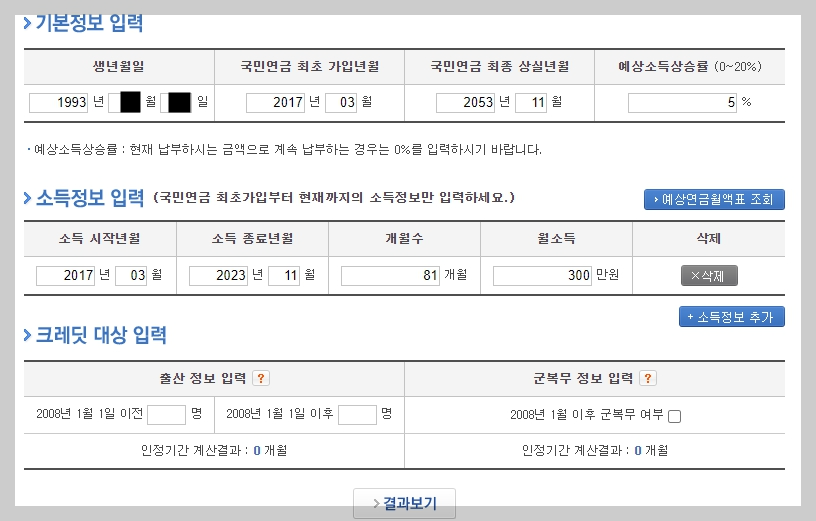 기본 정보를 입력합니다. 생년월일, 국민연금 가입년월, 상실년월, 예상소득상승률, 소득정보까지 입력합니다. 출산하거나 군복무를 했으면 더 기간이 인정되어서 연금이 산정됩니다. 30세 기준으로 계산해보았습니다. 60세까지 일한다고 가정해보겠습니다.  2017년 즉 6년 전부터 일했을 때를 가정해보겠습니다. 또한 월소득은 300만원으로 예상 소득 상승률은 5%입니다.(그랬으면 좋겠네요.)