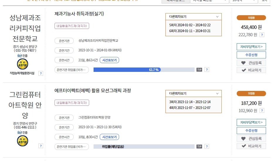훈련과정 탭을 클릭했습니다. 경기도로 조건을 걸어보았는데요. 수많은 훈련과정이 있습니다. 제과기능사 취득과정으로 예를 들어보겠습니다. 금액은 458,400원인데 자비 부담은 222,780원입니다. 우대 조건이면 더욱 할인이 됩니다.