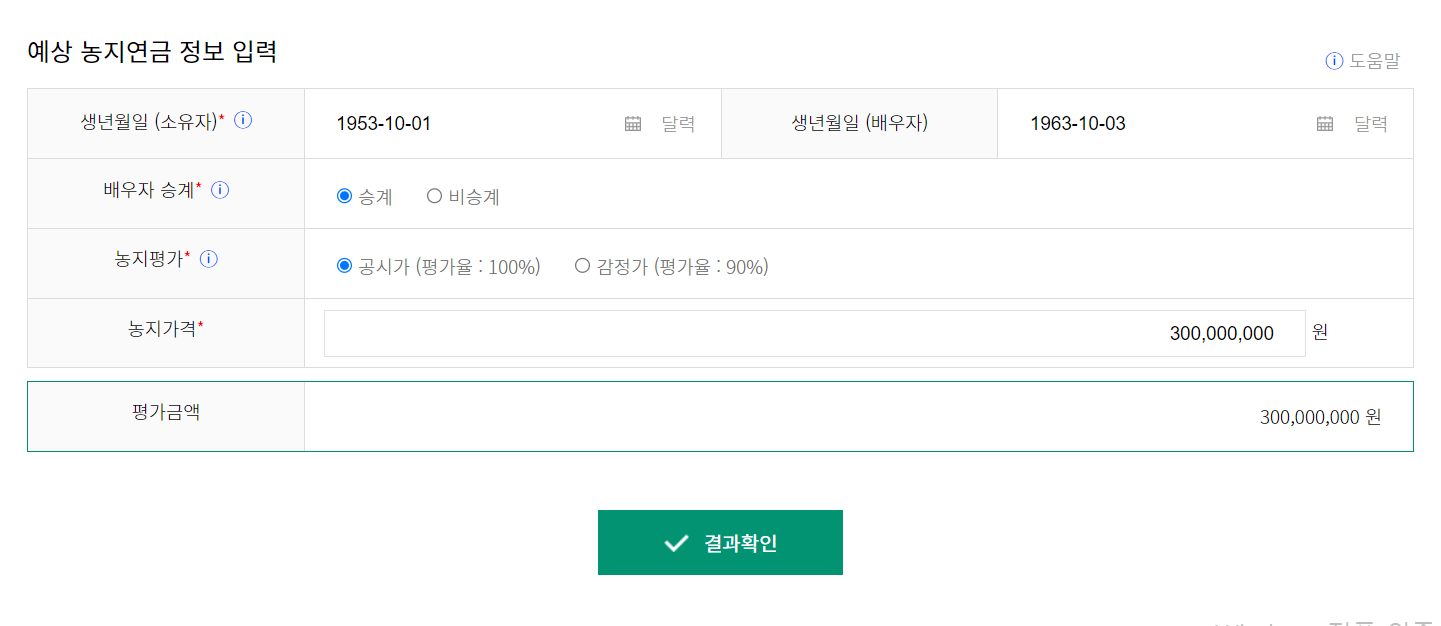 개인별로 예상되는 수령액은 농지은행 사이트에서 조회 가능합니다. 농지연금-> 예상연금액 조회를 클릭하면 됩니다. 신청자나 배우자의 나이, 소유한 농지의 가격을 입력하면 확인할 수 있습니다.