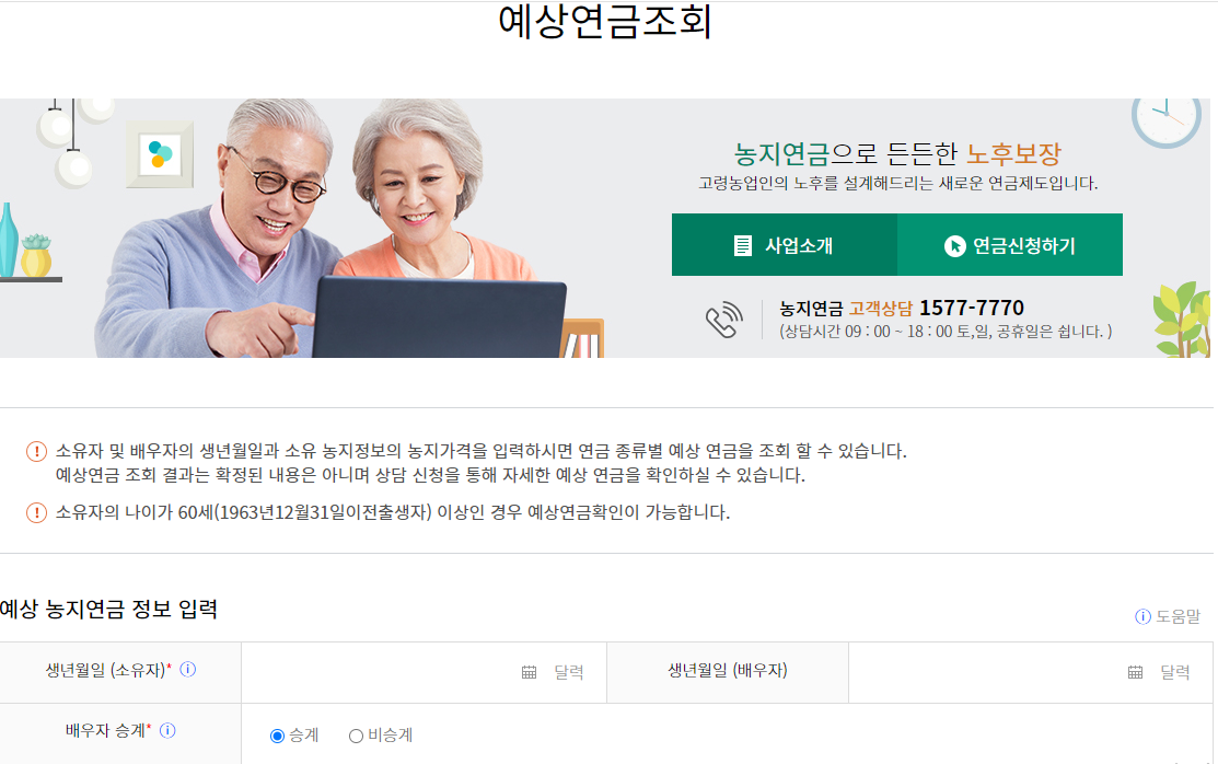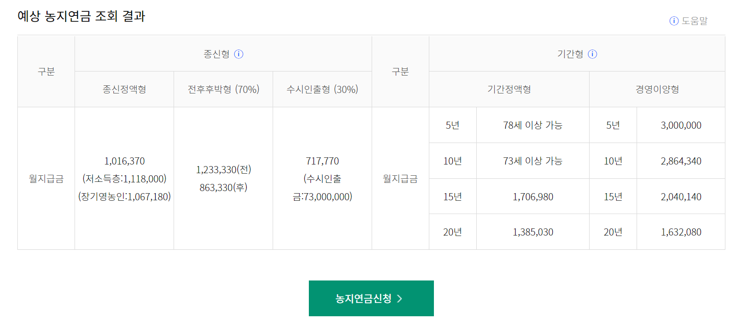 개인별로 예상되는 수령액은 농지은행 사이트에서 조회 가능합니다. 농지연금-> 예상연금액 조회를 클릭하면 됩니다. 신청자나 배우자의 나이, 소유한 농지의 가격을 입력하면 확인할 수 있습니다.