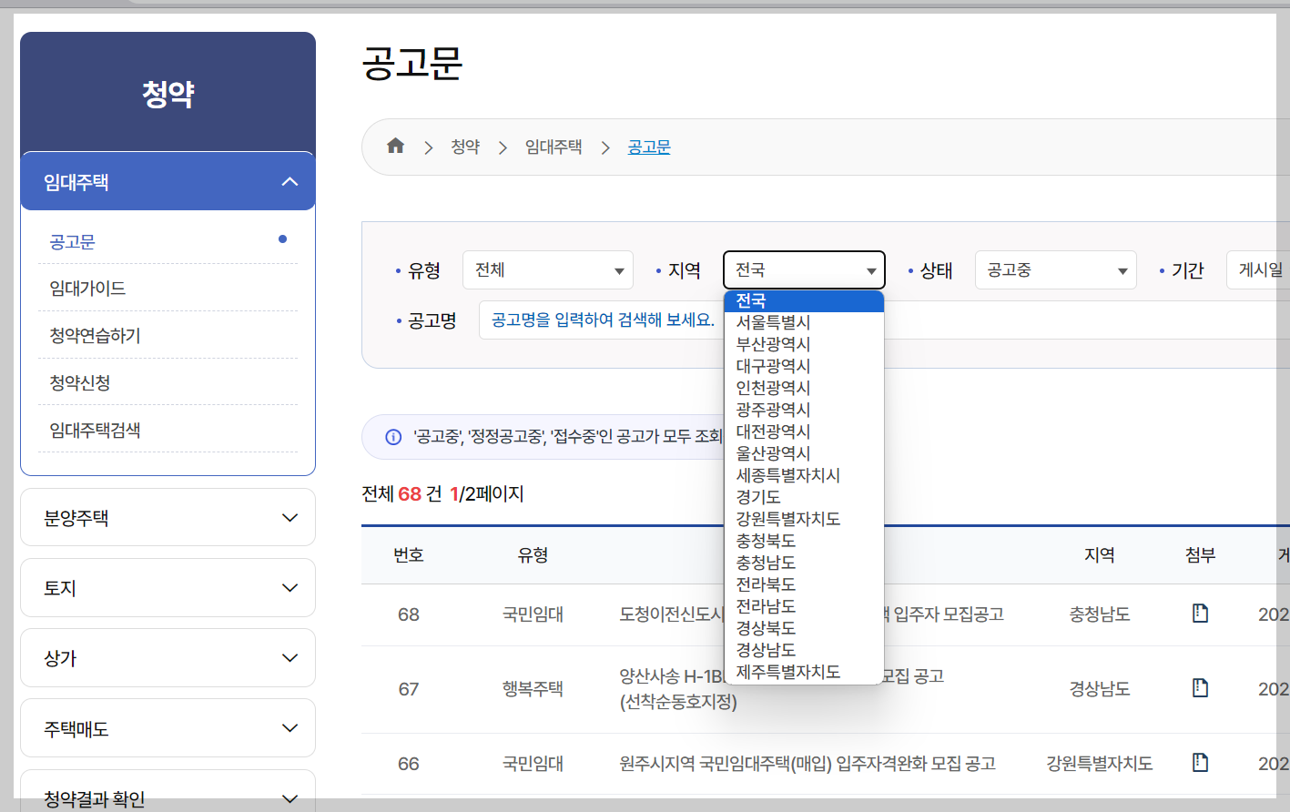 공고문을 보고, 자신이 살 수 있는 지역을 선택하고 조회하시면 됩니다. 모집 공고마다 조건이 다를 수 있으니 꼭! 홈페이지에서 확인해보세요.