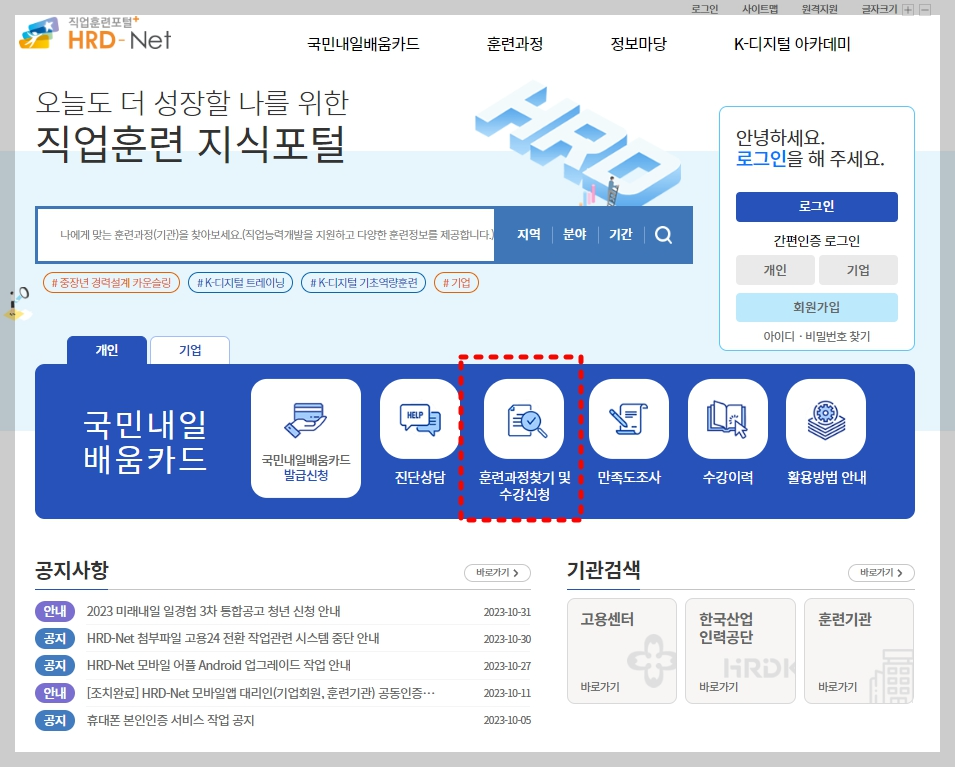 직업훈련포털에 들어가서 훈련과정 탭을 클릭합니다.