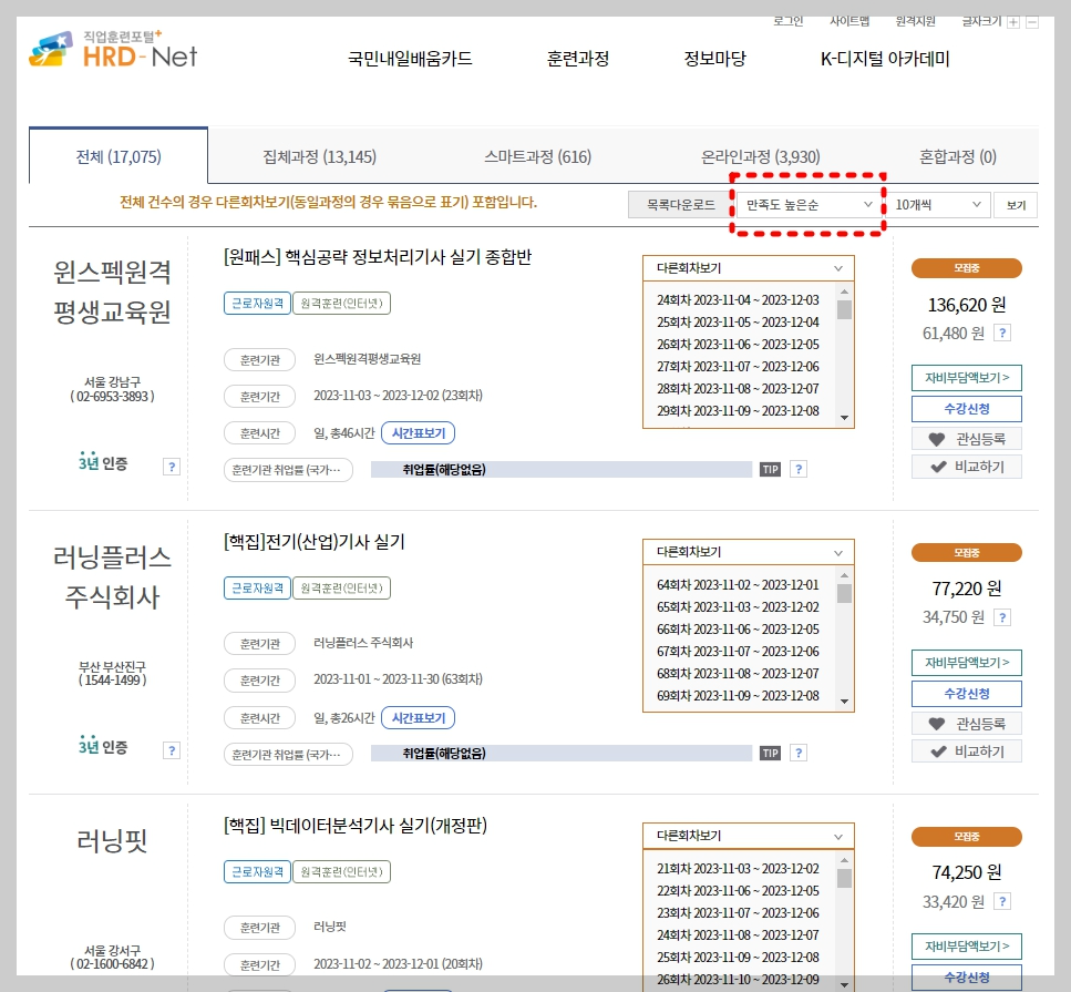 분야를 정하면 더욱 좋고 혹여 정하지 않았다고 해도 만족도 높은 순으로 정렬하셔서 보실 수 있습니다. 17000개의 강좌를 다 볼 순 없잖아요?