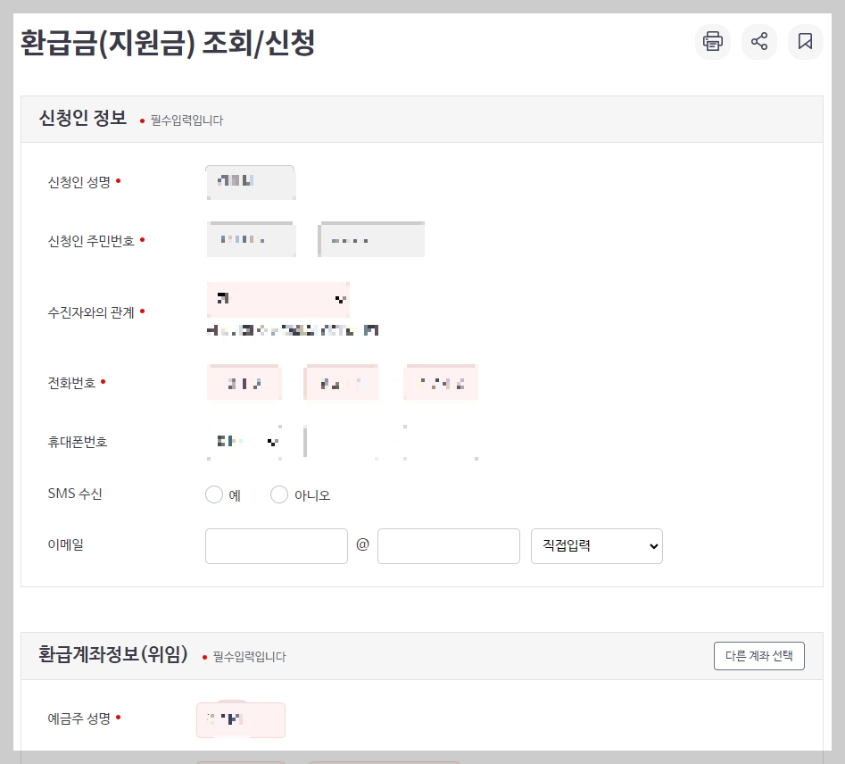 환급신청시 진료받은 사람 본인 예금계좌로 신청해야합니다. 부득이하게 직계 존, 비속의 예금계좌로 신청할 경우는 진단서나 소견서를 제출해야 합니다. 또한 제 3자에게 위임했을 때도 위임장과 신분증을 제출해야 합니다.