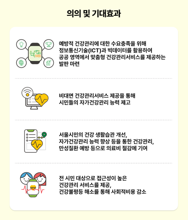 서울시에서 서울 시민을 대상으로 건강한 습관을 만들어주기 위한 건강 프로그램입니다. 19세부터 75세까지 신청이 가능합니다.  신체활동을 측정하여 최대 10만 포인트까지도 적립할 수 있습니다. 이용 시 포인트를 주는데 그 포인트를 병원, 약국, 헬스장 등에서 사용까지 가능하다고 합니다. 엄청나죠! 기본 카톡, 전화, 알림이 다 가능합니다. 또한 심박수 체크, 호흡 명상, 스트레스체크, 날씨정보, BMI 등 가능합니다.