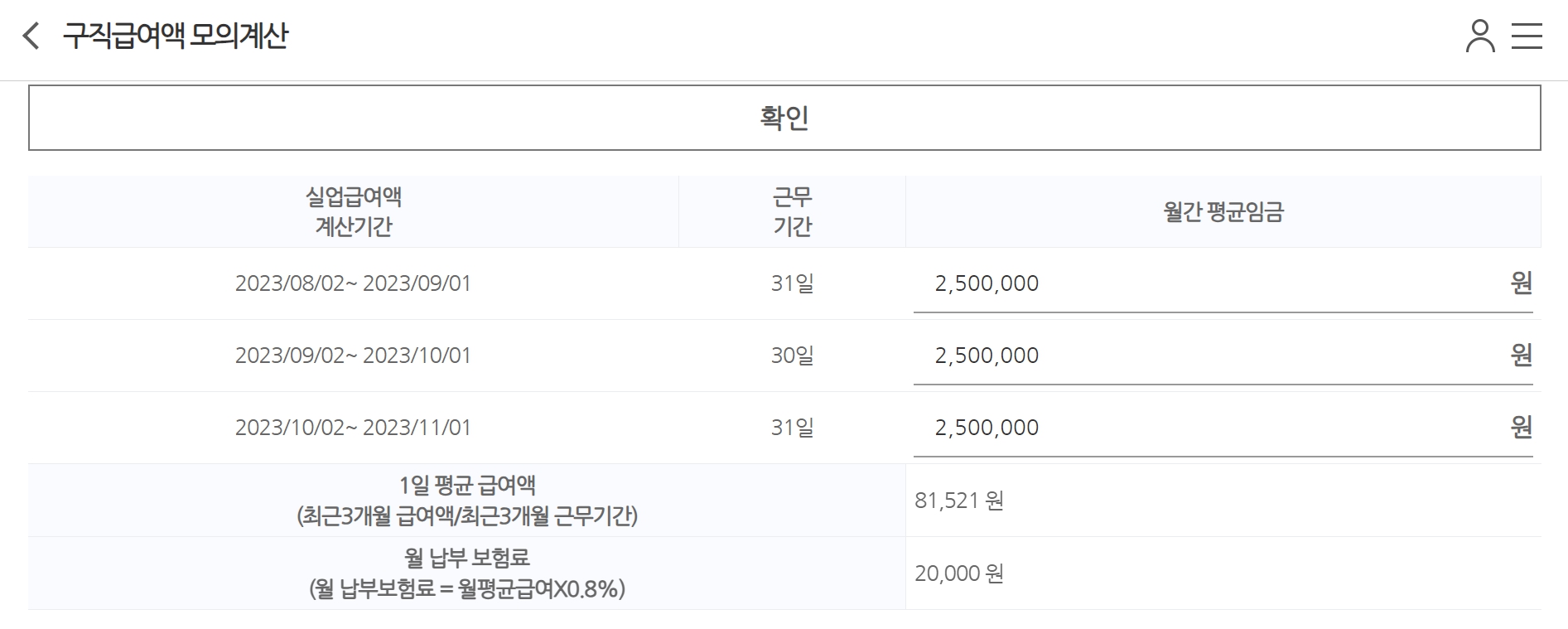 모의계산을 해보겠습니다. 5월 1일부터 11월 1일까지, 하루 8시 근무한 것으로 계산을 해보았습니다. 월 평균 임금은 250만원으로 계산하겠습니다.