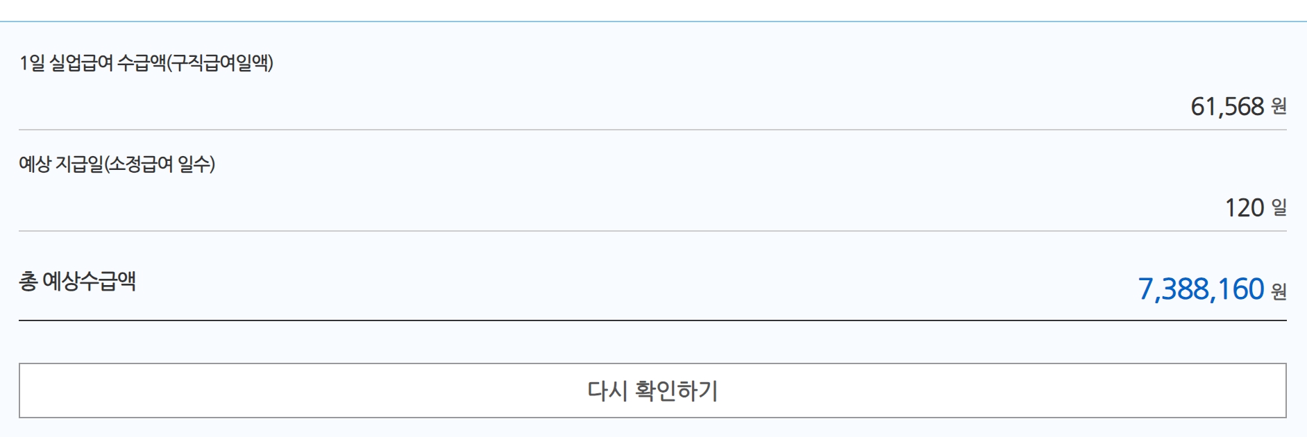 1일 평균 급여액에서 보험료를 빼면 하루에 6만원 정도를 수령할 수 있습니다. 120일동안이요. 그럼 4개월동안 총 730만원이라는 돈을 받게 됩니다. 모의계산은 여기 클릭해주시면 확인 가능합니다.