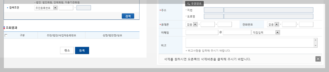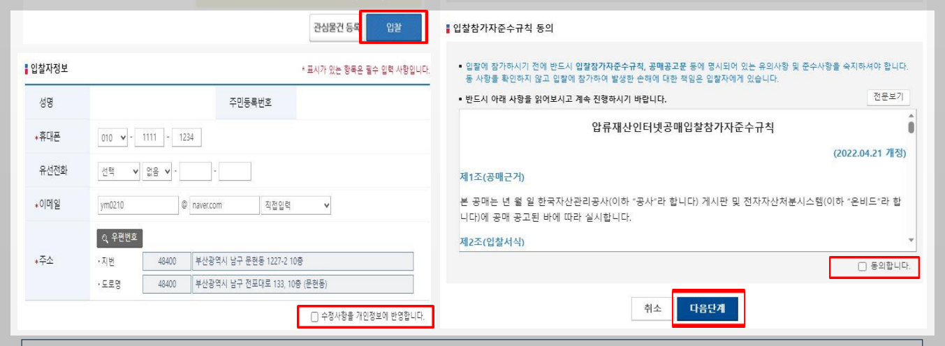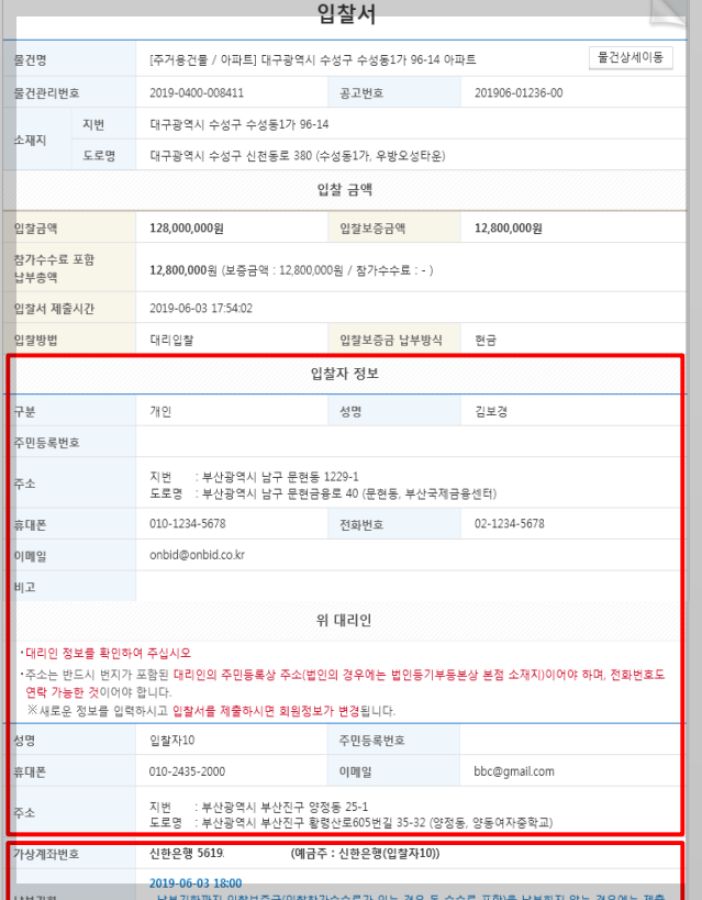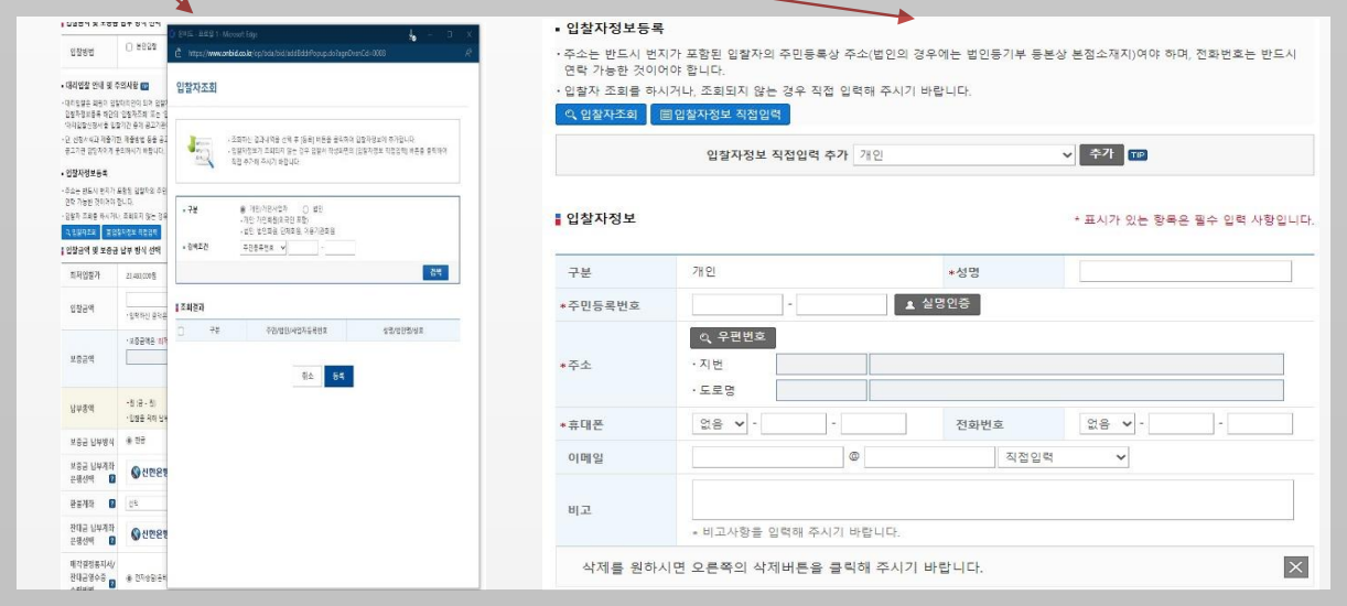 대리인이 아닌, 입찰자의 정보를 입력해주셔야 합니다. 성명, 주민등록번호, 주소, 휴대폰, 이메일.