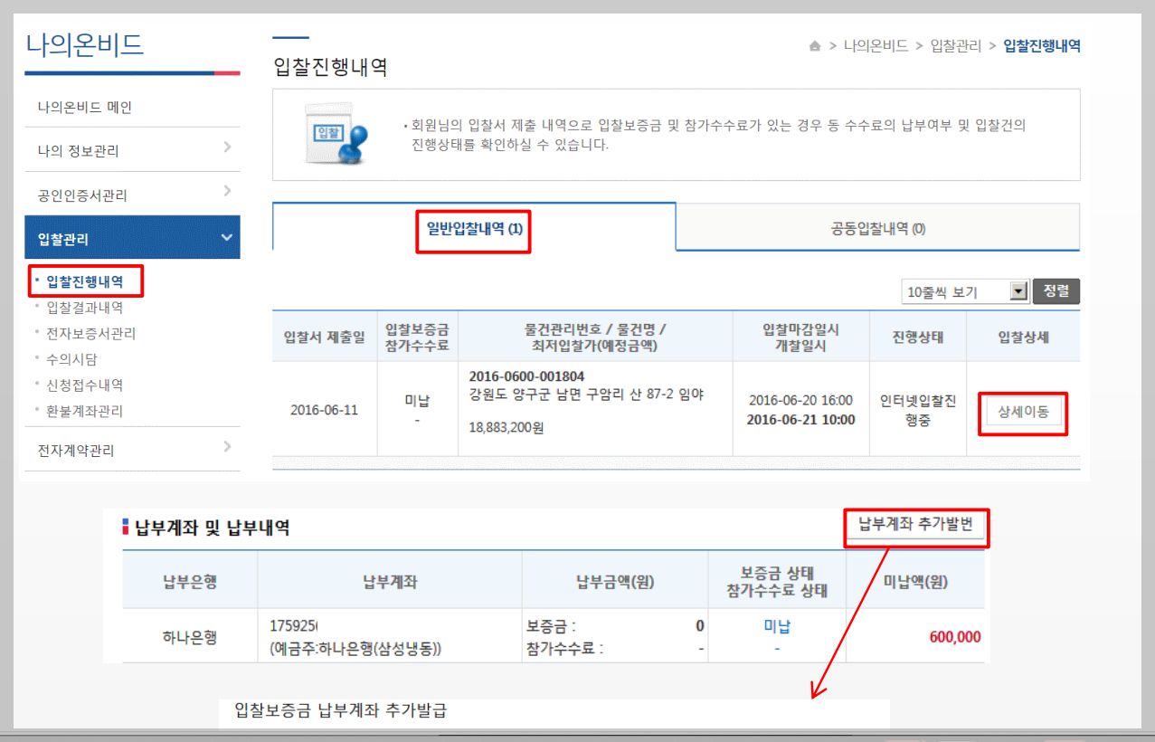 입찰 진행내역에 들어가면 입찰한 내역이 나옵니다. 상세 이동을 클릭해주면 납부 계좌 추가 발번이 있어요. 혹시 은행 등을 바꾸고 싶을 때 이용하면 됩니다.