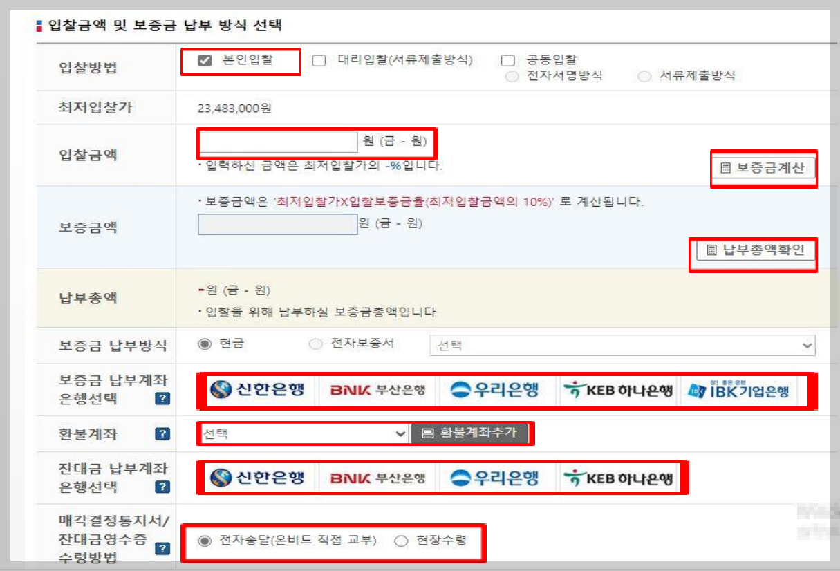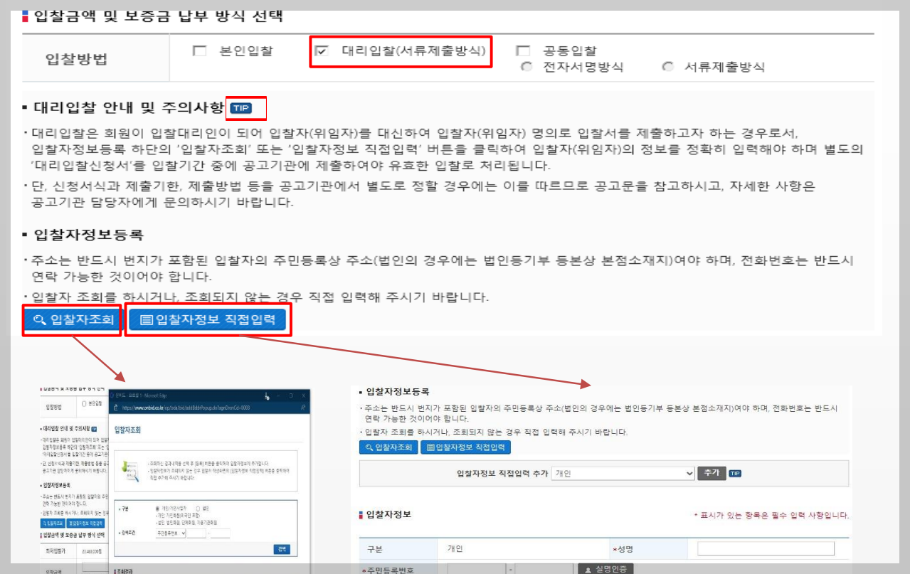 - 입찰 방법을 선택할 수 있어요. 본인입찰, 대리입찰(서류 제출), 공동입찰(전자서명, 서류제출)