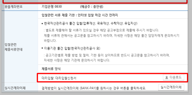 입찰서 자체에 서류가 있습니다. 입찰관련 제출서류 안내 탭에 '대리입찰신청서'를 '다운로드' 받아주세요. 혹시 잊으셨다면 온비드 홈페이지에도 확인할 수 있습니다.