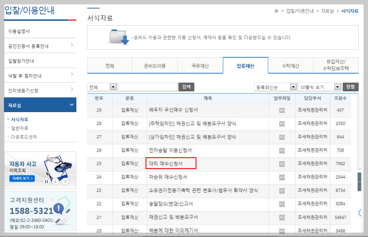 압류재산 탭에서 '대리 매수신청서'를 다운받으시면 됩니다.