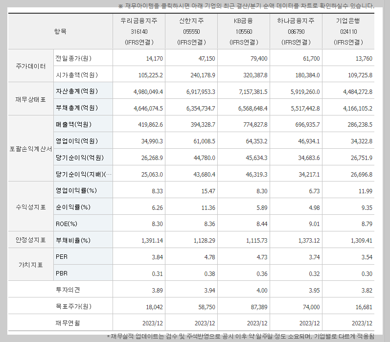 기업은행, 우리금융지주 등이 있습니다.