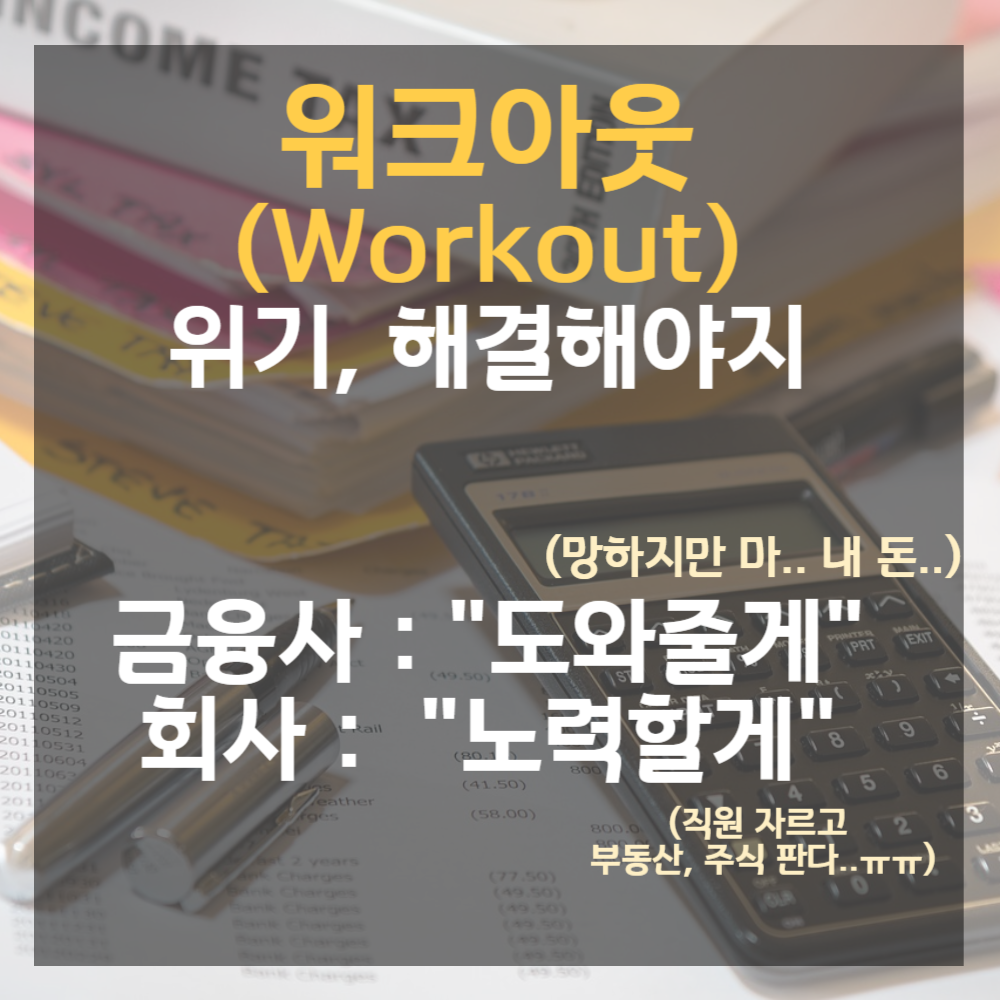 워크아웃(Workout)이란 회사가 도산, 부도 위기에 처했을 때, 즉 망할 것 같거나, 대금 등을 받지 못했을 때 일어납니다. 이런 위기 상황을 극복하기 위해 채무자와 채권자가 해결 방법을 찾는 활동을 말합니다. 일반적으로는 기업과 금융기관이 협의하는 것을 말합니다. 금융기관이 빚을 탕감해주거나, 회생 자금을 지원합니다. 채권단, 즉 돈을 빌려준 사람(은행이나 금융권 등이 되겠죠?)의 75%의 동의가 있는 조건 하에서. 이런 유동성이 부족한(현금이 부족한) 기업에 만기연장과 자금 지급을 해줍니다.