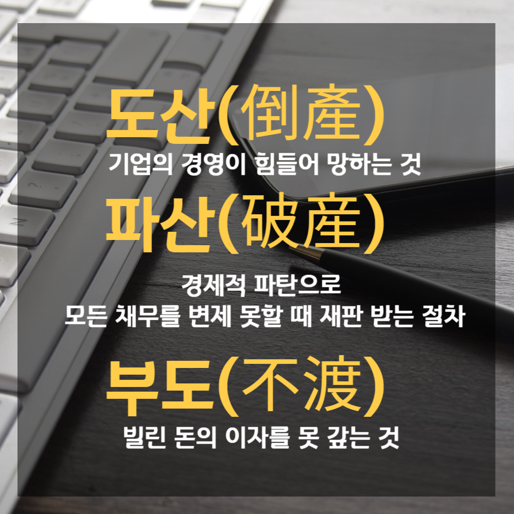 워크아웃을 알아보기 위해서 먼저 용어 정리부터 하겠습니다. 도산(倒產, 넘어질 도) 은 돈을 잃고 망한 상태, 넘어진 상태입니다. 파산보다 더 넓은 용어로 쓰입니다. 파산(破産, 깨질 파)은 완전히 망한 상태. 부도(不渡, 건네줄 도)는 기한이 되도 돈을 건네주지 못한 상태를 말합니다. 즉 이자를 내지 못하는 것이겠죠. '건설사 부도'의 뜻은 건설사가 금융 비용을 내지 못했다는 뜻과 같습니다.