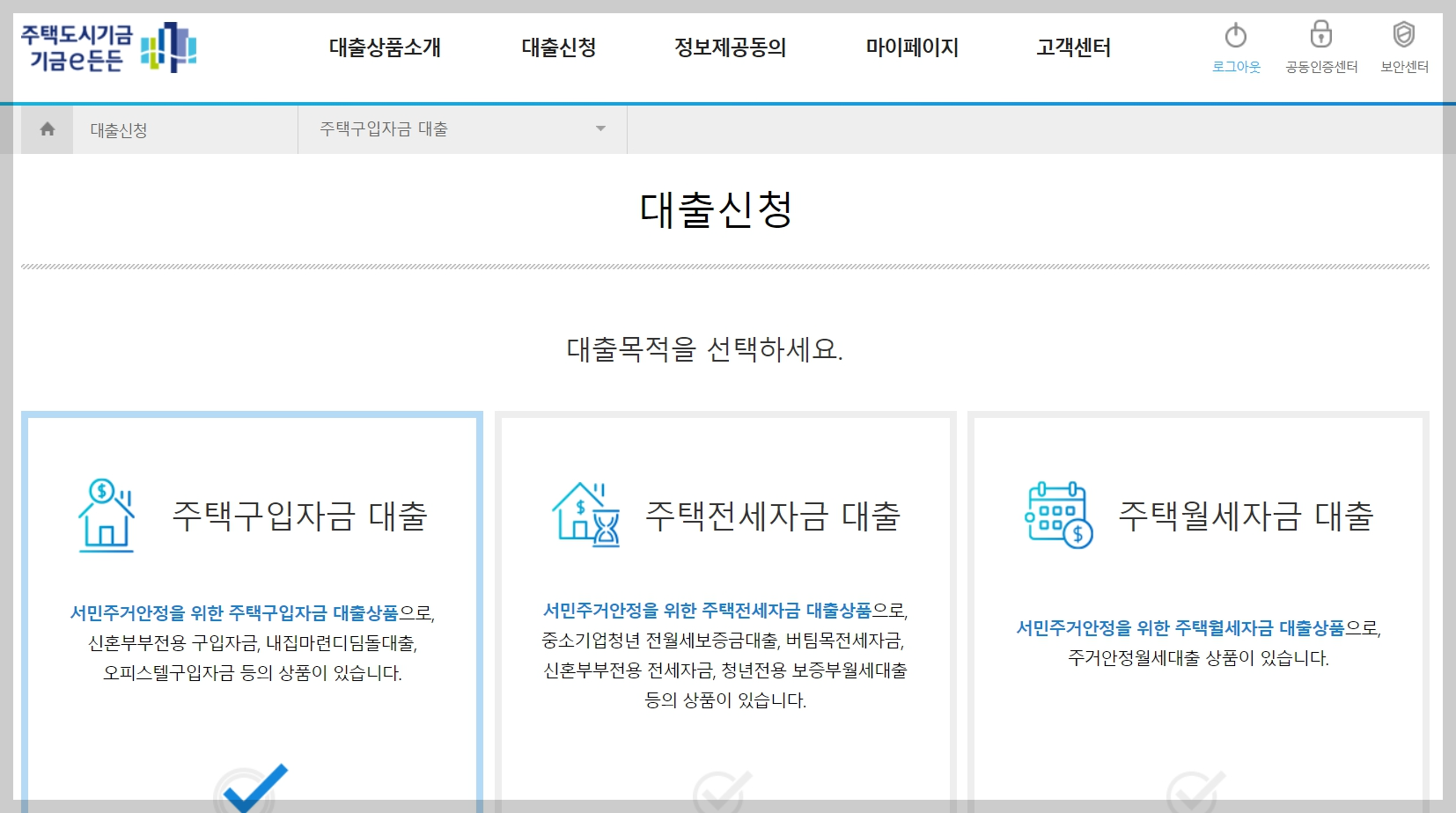 2) 대출신청 탭 > 대출구입자금 클릭