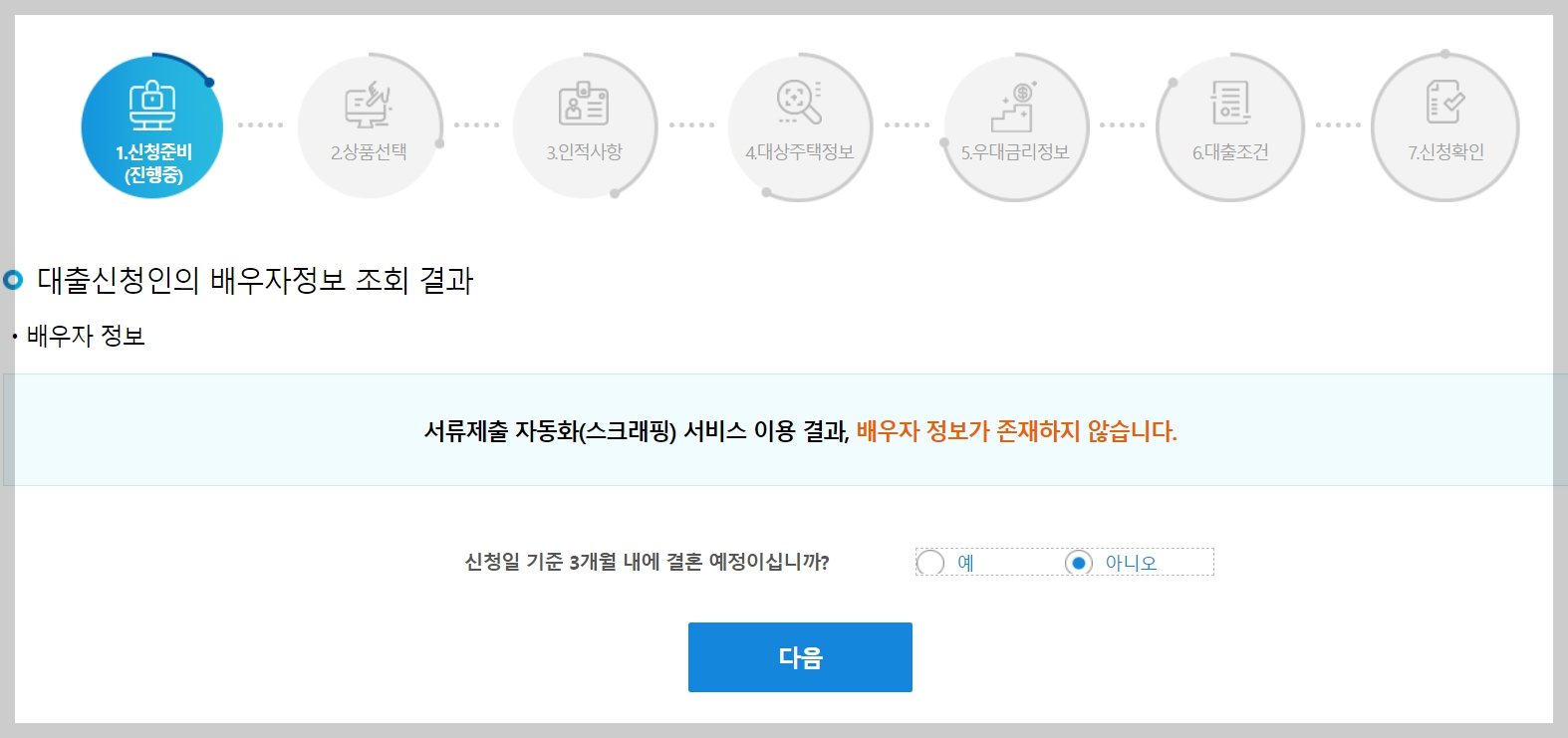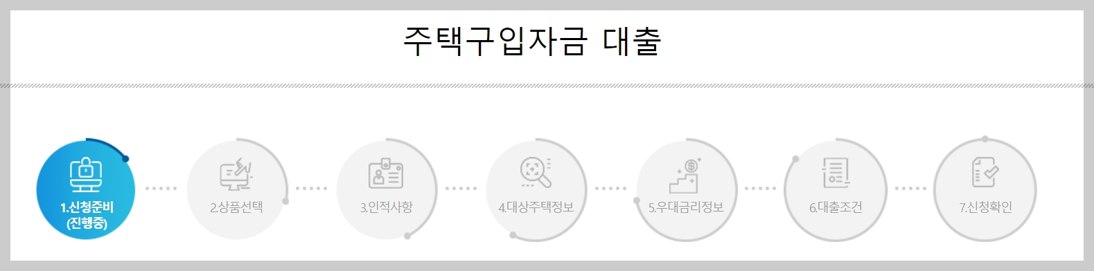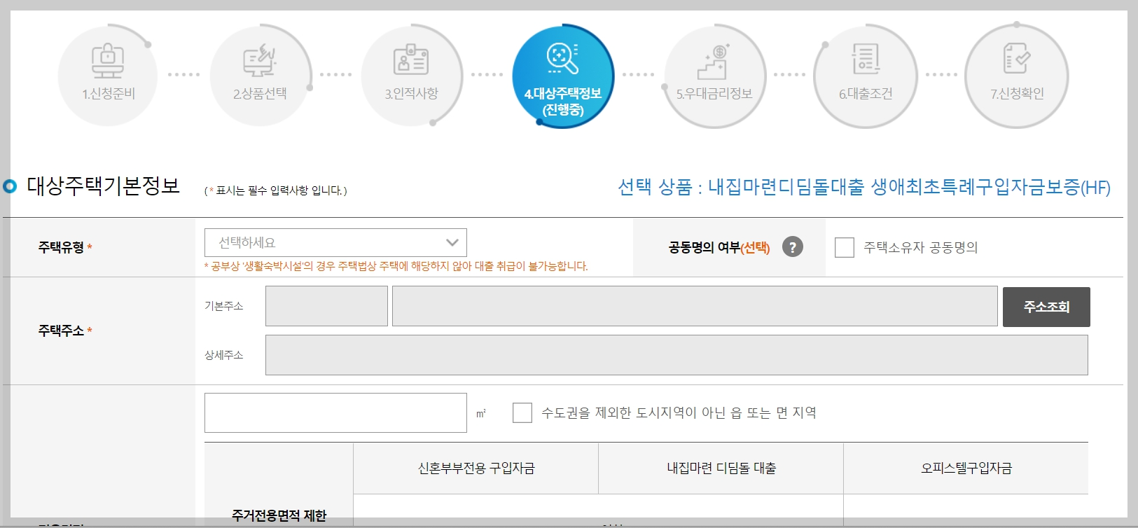 신청준비 -> 상품선택 -> 인적사항 -> 대상주택정보 -> 우대금리정보 -> 대출조건 -> 신청확인 순으로 이루어집니다. 화면에 보이는 대로 신청하시면 됩니다.