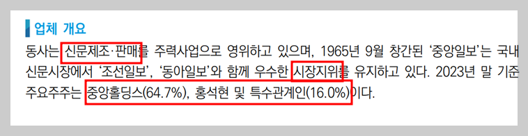 중앙일보는 신문제조 및 판매를 하는 기업으로