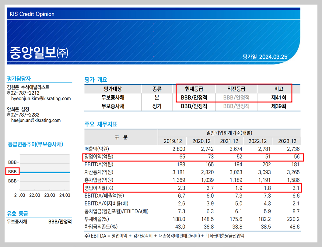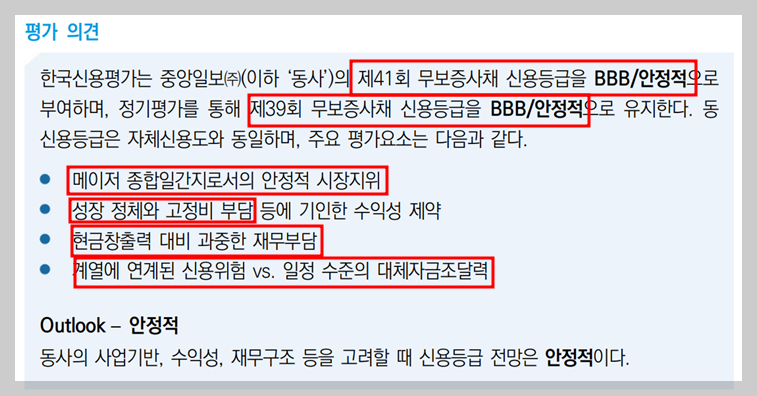 중앙일보41 채권 신용평가서 회사정보까지 BBB 믿고 투자할 수 있을까?