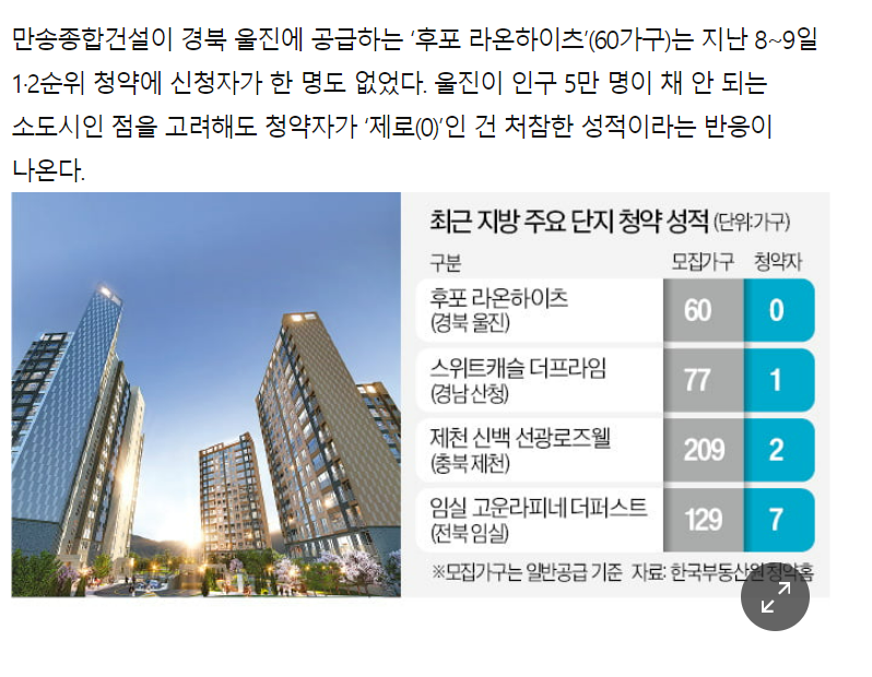 요즘 수도권에서도 청약 미달이 나오고 있다고 합니다. 수도권이 그 정도면 지방은, 그 중에서도 지방 소도시는 더욱 심하겠죠. 기사에 나온 중소도시는 경북 울진, 경남 산청, 충북 제천, 전북 임실 등입니다.