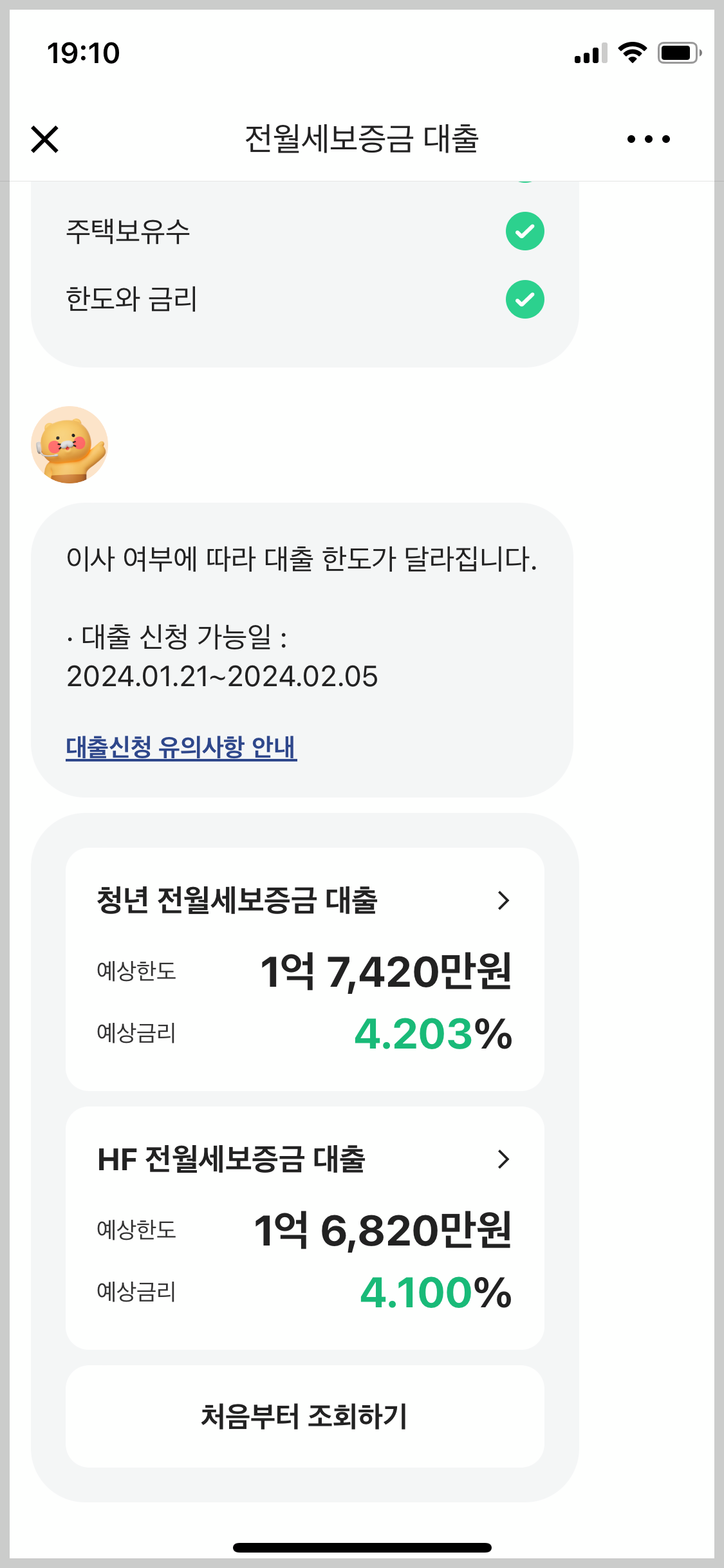 정말 3분도 안되는 시간에 조회가 가능합니다. 저는 우선 연소득 4천 후반대입니다. 집 보증금은 2억 4천이구요. 미혼이며 무주택자입니다. 그 조건으로 조회했을 때, 1억 6~7천 정도까지 받을 수 있고 금리는 4.1~4.2%입니다. 타 은행에 비해서 높은 편입니다.