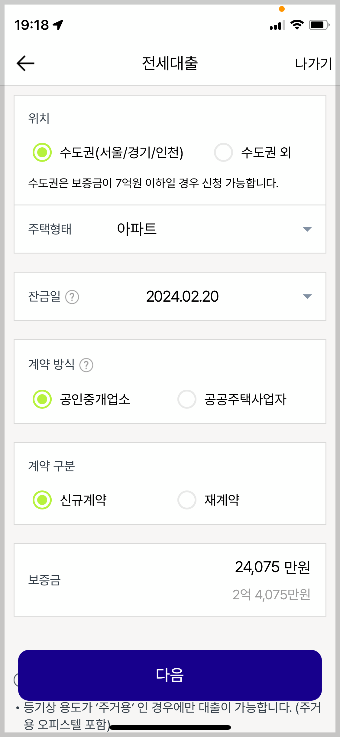 수도권에 아파트에 전세로 들어가기로 했고, 신규 계약입니다. 저는 2억 4천만원의 전세금을 보증금으로 하고 있어요. 연 소득은 4천 후반 대이며, 미혼이며 무주택입니다. 그 조건으로 조회해보았습니다.