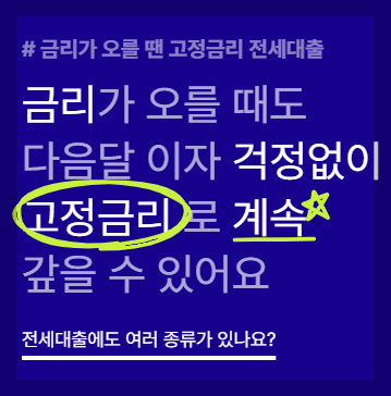 전에 했던 카카오뱅크보다 저렴하게 나왔네요! 한도는 비슷한데 금리는 0.3~0.4% 저렴합니다! 또한 특이하게 고정금리 전세대출이 있어요. 더 저렴하기도 하구요. 변동금리면 금리가 올라갔을 때 높은 이자율로 힘들 수 있잖아요. 요즘 시기에는 고정금리 전세대출이 나을 것 같습니다.