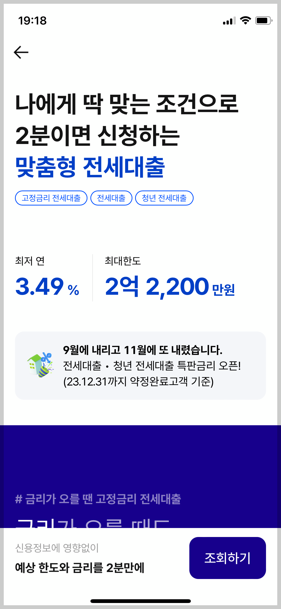 케이뱅크의 전세대출 상품입니다. 최저 연 3.49%, 최대 한도 2억 2200만원까지입니다.