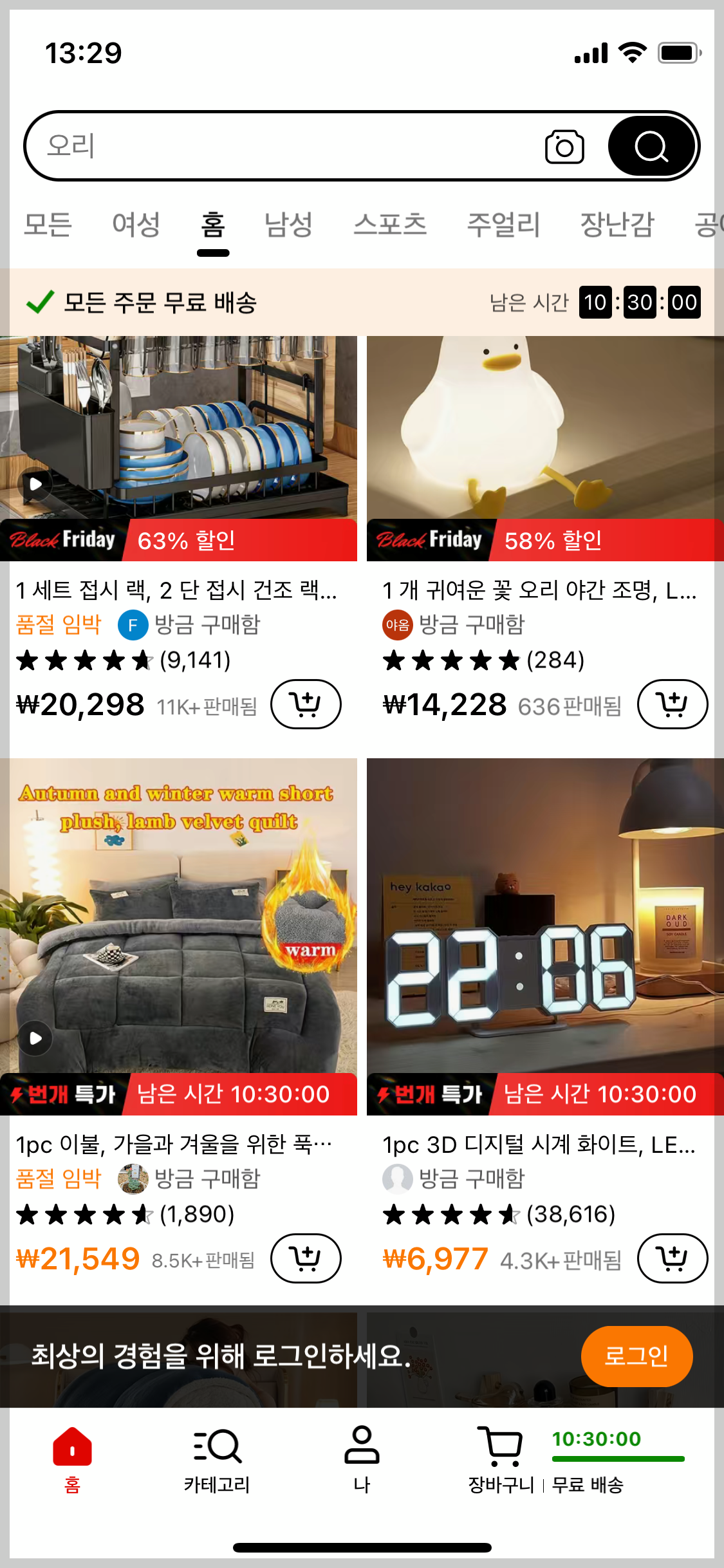 모든 카테고리입니다. 아이패드 프로..? 저 가격이 맞을까요? 귀여운 오리도, 앞 유리 차단, 우주 프로젝터 등이 상단에 위치해있고 상당히 많은 제품들이 하단에 있습니다. 재미있네요!
