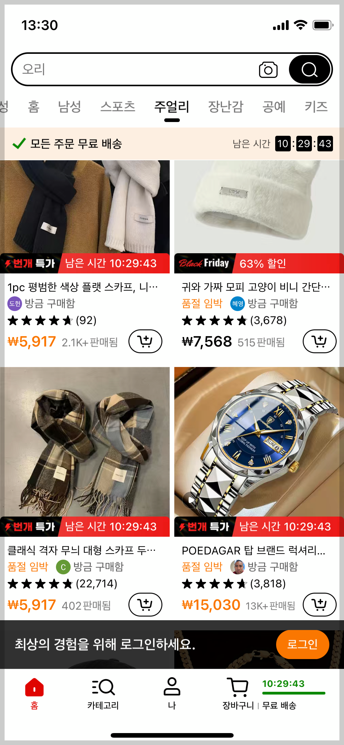 주얼리로 들어가면 소품이나 시계, 머플러 등이 보이네요. 정-말 저렴합니다. 배송비에 얼마를 붙여서 파는지 모르겠는 저 가격이 정말 신기하네요.