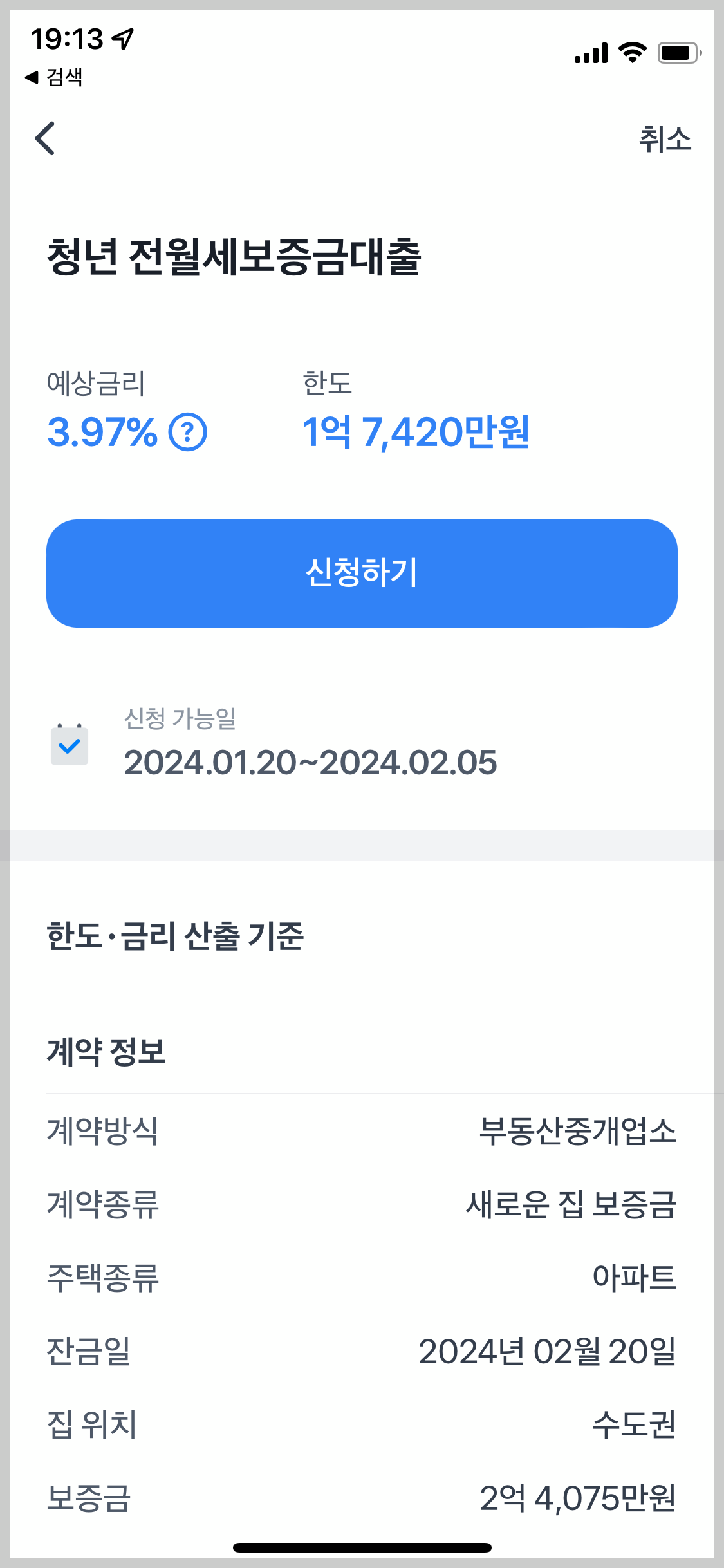 저는 아파트로 이사가기로 했고 보증금은 2억 4천만원 정도입니다. 연소득은 5천이 조금 안되고, 미혼이며, 무주택입니다. 이 조건으로 조회해 본 결과는 다음과 같습니다!