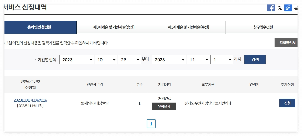 열람신청을 누르고 소재지, 연혁인쇄유무, 폐쇄대장구분, 공시지가기준년도를 입력해서 검색합니다. 발급이 되었네요. 바로 열람 가능합니다.