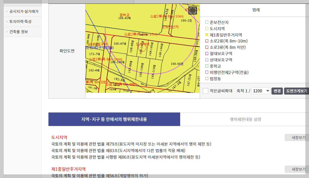 확인 도면이 보입니다. 그 주위에 필지가 어떻게 나뉘어 있는지 확인할 수 있네요. 이 지도에 의하면 이곳은 제1종일반주거지역이겠네요. 왜요? 노란색이잖아요! 색으로 보시면 된답니다. 이 지역 지구에서 행위가 제한되는 것들이 아래 보면 보입니다. 부동산은 용어 싸움이죠. 편리하게 용어 설명이 오른쪽 탭에 있습니다. 눌러볼까요?