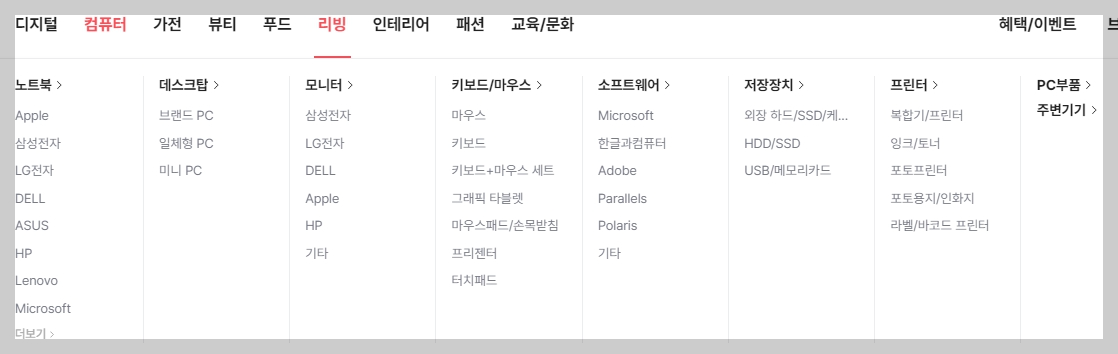 컴퓨터입니다. 노트북, 데스크탑, 모니터, 키보드/마우스, 소프트웨어, 저장장치, 프린터 등이 있습니다. 애플, 삼성, LG, DELL 등 상위브랜드부터 가성비브랜드까지 다양합니다.