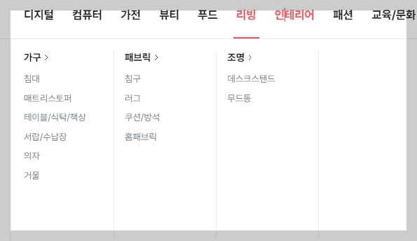 패션 영역에도 여성, 남성, 언더웨어, 가방, 신발까지 정말 없는 게 없네요!