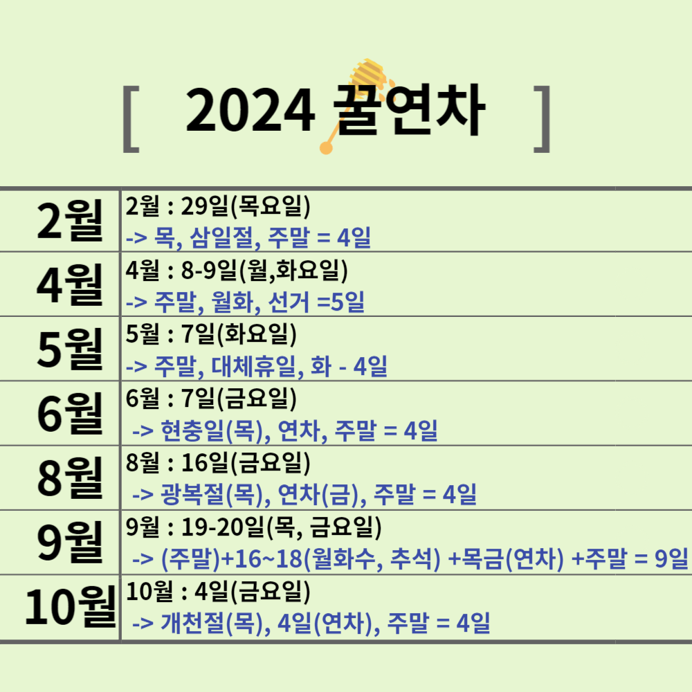 이번 글에서는 2024년 공휴일을 알아보고, 연차를 쓰면 휴가처럼 쭉 쉴 수 있는 꿀 연차 목록까지 한번에 정리해서 가져왔습니다.