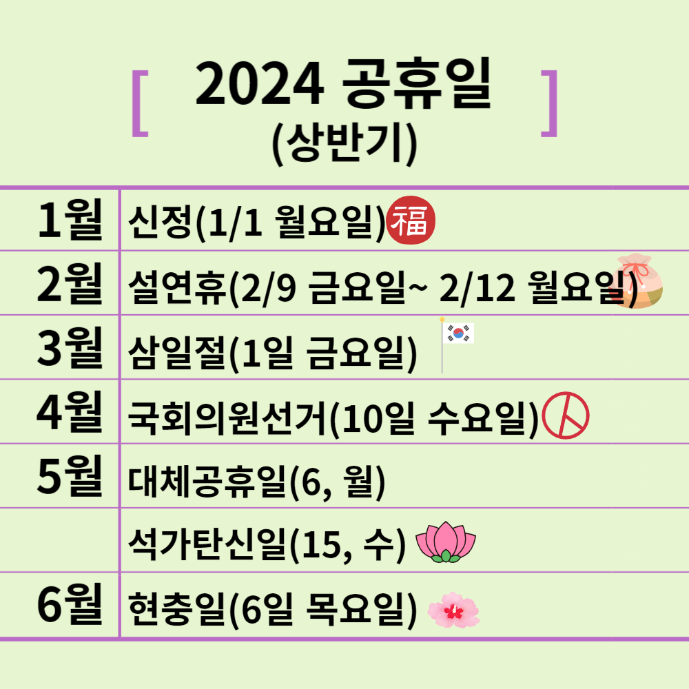 이번 글에서는 2024년 공휴일을 알아보고, 연차를 쓰면 휴가처럼 쭉 쉴 수 있는 꿀 연차 목록까지 한번에 정리해서 가져왔습니다.