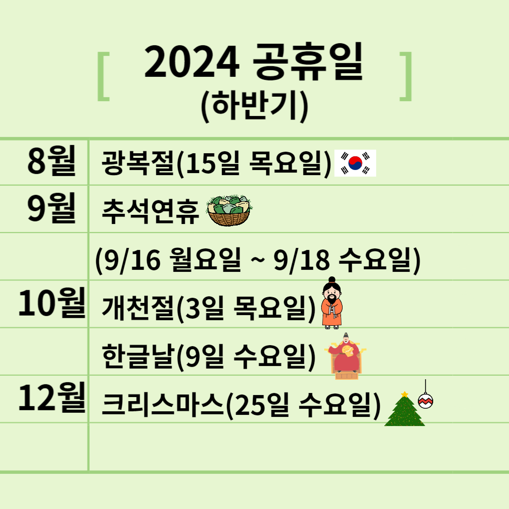 9월 : 추석연휴(9/16 월요일 ~ 9/18 수요일)
